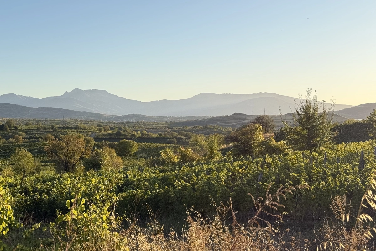 Bio-Weingarten bei Kavadarci in Nordmazedonien in der Abendsonne. Foto: BioBalkan